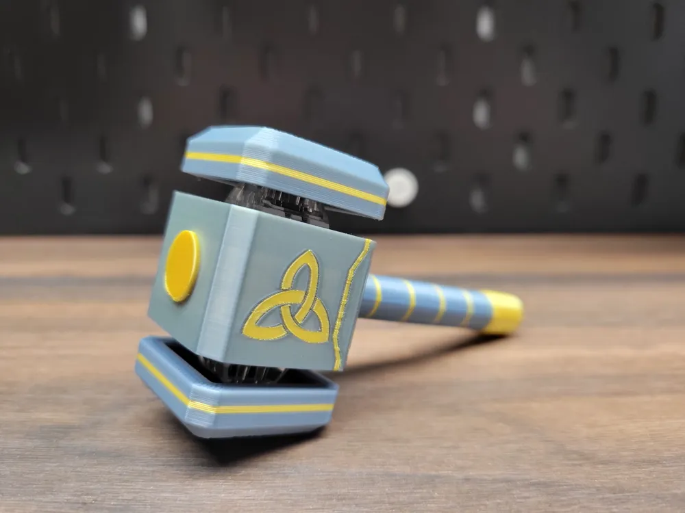 Este é um fidget spinner/clicker projetado com base no poderoso martelo de Thor, Mjölnir. A cabeça do martelo gira em torno do cabo. Ambos os lados da cabeça do martelo contêm interruptores mecânicos de teclado com clique. É um design simples que não requer ferramentas (ou vingadores) para montar. Todas as peças encaixam-se. Claro, você pode aplicar um pouco de cola para torná-lo extra durável. Existem quatro versões: Spiny Multi Color: O design descrito (com clique e espinhos). Objetos separados para impressão multicolorida. Spiny Single Color: O design descrito (com clique e espinhos). Decorações recuadas para impressão em uma única cor. Fixy Multi Color: O cabo é fixo à cabeça do martelo (somente com clique). Objetos separados para impressão multicolorida. Fixy Single Color: O cabo é fixo à cabeça do martelo (somente com clique). Decorações recuadas para impressão em uma única cor. Peças necessárias: 1x Rolamento de esferas 687 (diâmetro interno: 7mm, diâmetro externo: 14mm) (não necessário para a versão fixy). Largura do rolamento suportada: 3,5 mm (design padrão) 5,0 mm (perfil de impressão “Base Interna para rolamento de 5 mm de largura”) 2x Chaves mecânicas de teclado (useia chaves Kailh Box Navy) Montagem: Não são necessárias ferramentas Se você deseja uma versão maior, confira a BigBoiEdition: Alterações: 20-fev-2025: Adicionada reentrância de 0,4 mm às decorações em ambos os modelos de cor única 21-fev-2025: Perfis de impressão adicionados para cada versão 21-fev-2025: Perfil adicionado “KeySwitchHammer_base_spiny_inside_5mm_bearing” para um rolamento 687 W5 (5 mm em vez de 3,5) 27-fev-2025: Perfil adicionado “Versão reforçada do eixo para a versão espinhosa” 03-mar-2025: Versão chaveiro adicionada ao perfil “Versão reforçada do eixo para a versão espinhosa” Divirta-se imprimindo. Deixe um like, comente se tiver algum problema e, se estiver se sentindo generoso, deixe um boost.